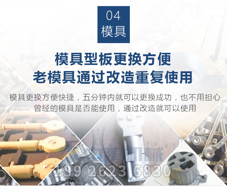 4、運(yùn)行成本低,安全可靠,維修方便,提供持續(xù)生產(chǎn)力,造型速度達(dá)每小時(shí)100型左右(不包括下芯時(shí)間);